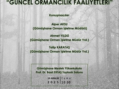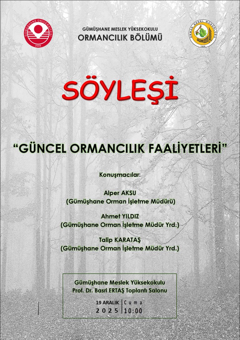 Bölümümüz ve Gümüşhane Orman İşletme Müdürlüğü işbirliğinde, 19 Aralık 2025 Cuma günü saat 10:00'da Gümüşhane Meslek Yüksekokulu Prof. Dr. Basri Ertaş toplantı salonunda "Güncel Ormancılık Faaliyetleri" konulu söyleşi gerçekleştirilecektir.